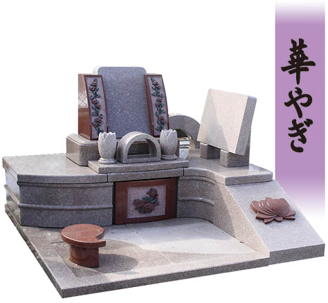6尺角(1.8m角) 地上納骨堂と外柵が一体になっています。 花の象嵌加工が美しい。当店オリジナルデザイン 洋型墓石・墓誌